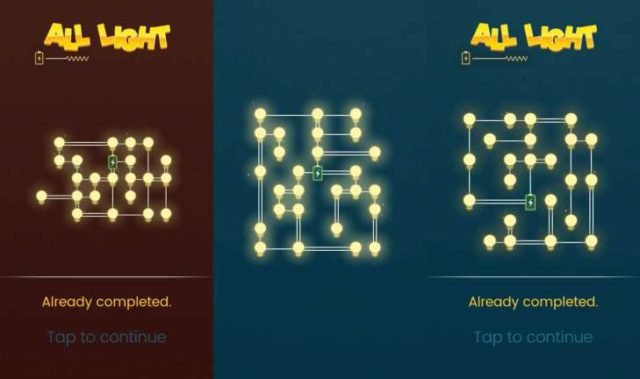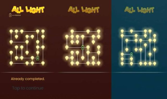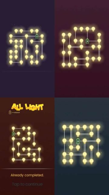 All Light – a puzzle game developed by Soulgit Games. Available for Android devices on Google PlayStore. ALL LIGHT is a wire connection puzzle game that contains 420+ puzzles with increasing difficulty packed in 7 packs A B C D E F G H and I, Each pack consists of 60 puzzles. If you love puzzle games, then you must play this game. In this game you have to connect battery to various lamps but you have to keep in mind that you cannot connect more or fewer wires and all bulbs should be connected. This puzzle game has amazing graphics with soothing sound effects. You can take a hint in 5 coins and you can purchase ad free version. Here I have solved all the puzzles to help you if you are stuck at any pack or any level. Scroll Below to find Solutions.