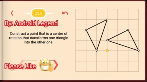 - Pythagorea Level 23.8: Construct a point that is a center of rotation that transforms one triangle into the other One.