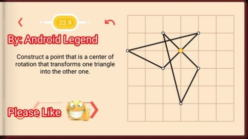 - Pythagorea Level 23.9: Construct a point that is a center of rotation that transforms one triangle into the other One.