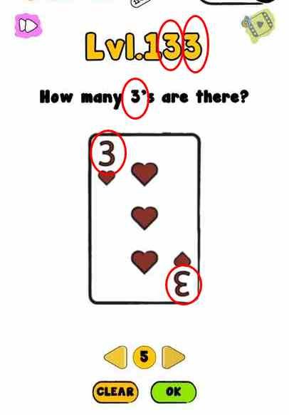 There are Five 3’s including Level 133 (2 3’s are here) and one in the question.