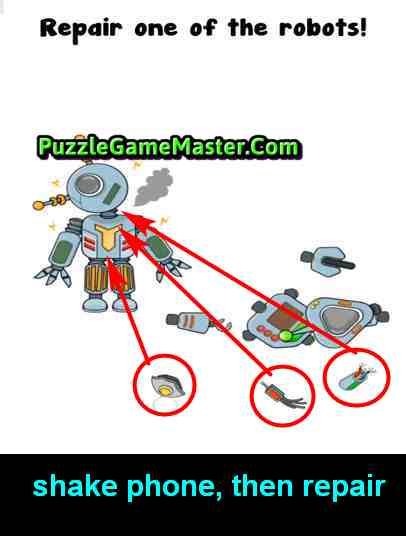 Hint: Shake to dismantle one of the robots, then use its parts to repair another robot, see image hint.