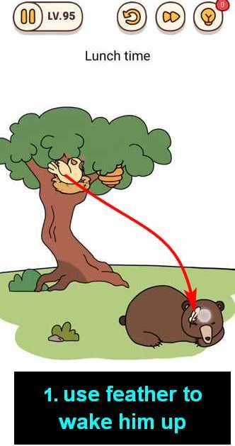 Answer: Swipe on the bird to pull out the feather and put it on the bear’s nose to wake it, now drag the bear to get the bee-hive.