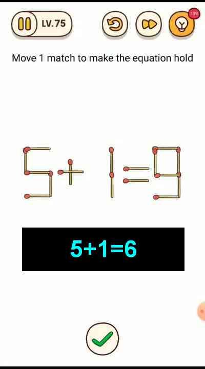 Move 1 match 5+1=9 to hold the equation true Brain find Level 75 Answer