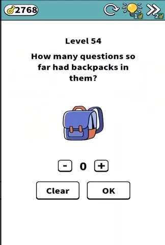 Brain puzzle iq challenge: How many questions so far had backpacks in them?