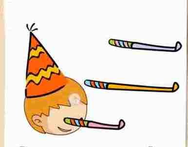 Move his mouth close to all party horns to blow all the party horns to see which is the longest, then click on the longest.