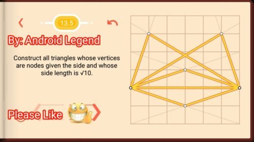 Pythagorea Level 13.5: Construct all triangles whose vertices are nodes given the side and whose side length is root 10.