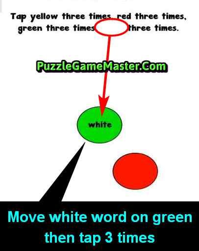 Hint: Tap Yellow and Red 3 times each then combine blue and yellow to make green then tap it 3 times, then drag the word ‘white’ from the title to green then tap it, see image below: